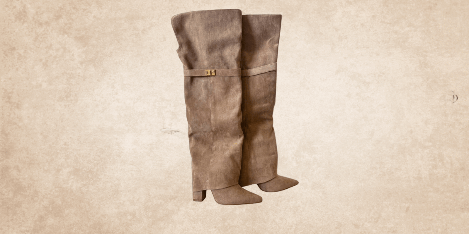 Stivali alti da donna in morbido camoscio marrone con punta affusolata e risvolto elegante.