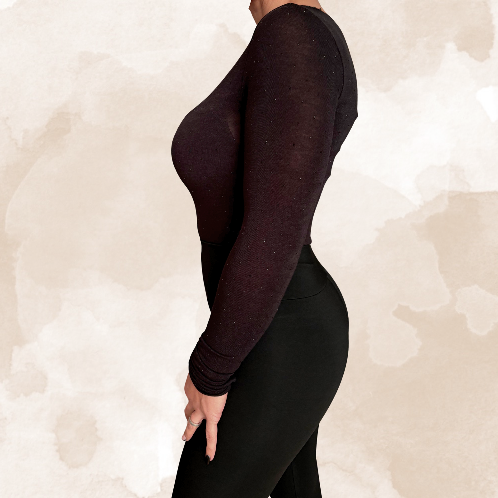 Dank der langen Ärmel und des minimalistischen Designs lässt sich der Body perfekt mit High-Waist-Hosen, Röcken oder unter einem Blazer tragen. Ein Must-have für alle, die Eleganz und Glanz in einem Kleidungsstück suchen.