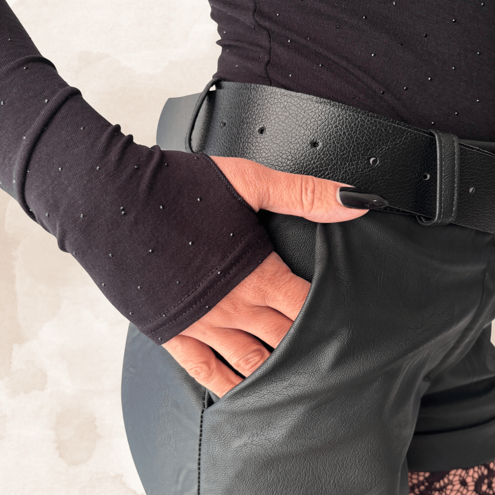 Il design è impreziosito da piccoli brillantini delicatamente distribuiti su tutta la superficie, sia sul fronte che sulla schiena, per un effetto luminoso ed elegante senza risultare eccessivo. Il colore nero dona un look sofisticato e senza tempo, ideale sia per outfit serali che per abbinamenti più fashion da giorno.