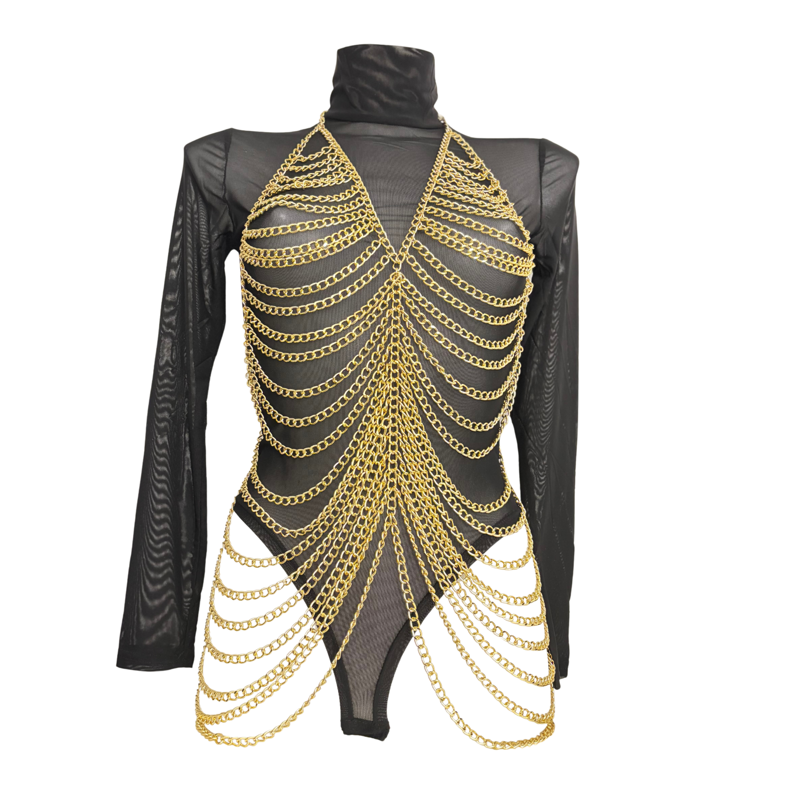 Questa elegante bodychain dorata è un accessorio raffinato e sensuale che esalta la silhouette femminile con un delicato tocco di luce. Le sottili maglie intrecciate si posano armoniosamente su spalle, décolleté e fianchi, creando un effetto glamour e sofisticato.
