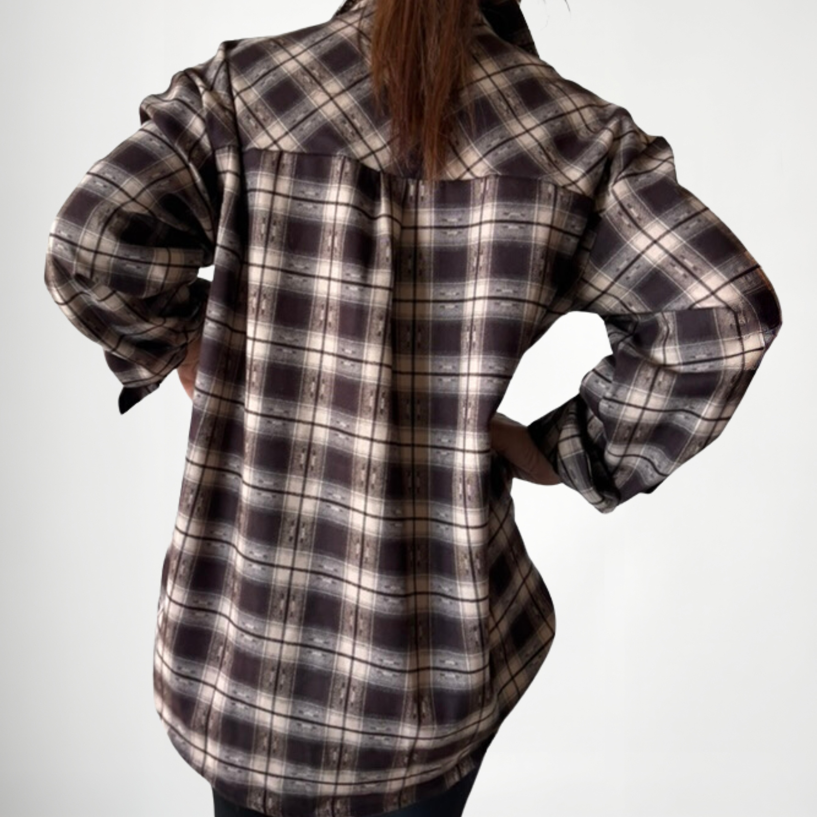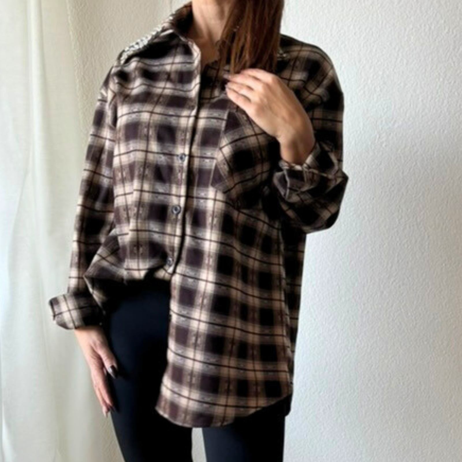 Questa camicia femminile a quadretti marrone unisce uno stile casual-chic a dettagli raffinati e luminosi. Il tessuto morbido e leggero garantisce comfort e una vestibilità piacevole, mentre il taglio leggermente lungo permette di indossarla sia con pantaloni aderenti che come capo oversize su leggings.