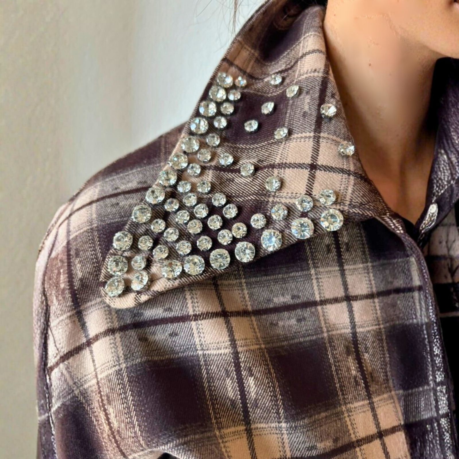 Das Highlight ist der große Kragen, der mit funkelnden Strasssteinen besetzt ist und dem Hemd einen eleganten, auffälligen Akzent verleiht. Das Karomuster sorgt für einen klassischen, vielseitigen Stil, der sowohl für den Alltag als auch für besondere Anlässe geeignet ist.