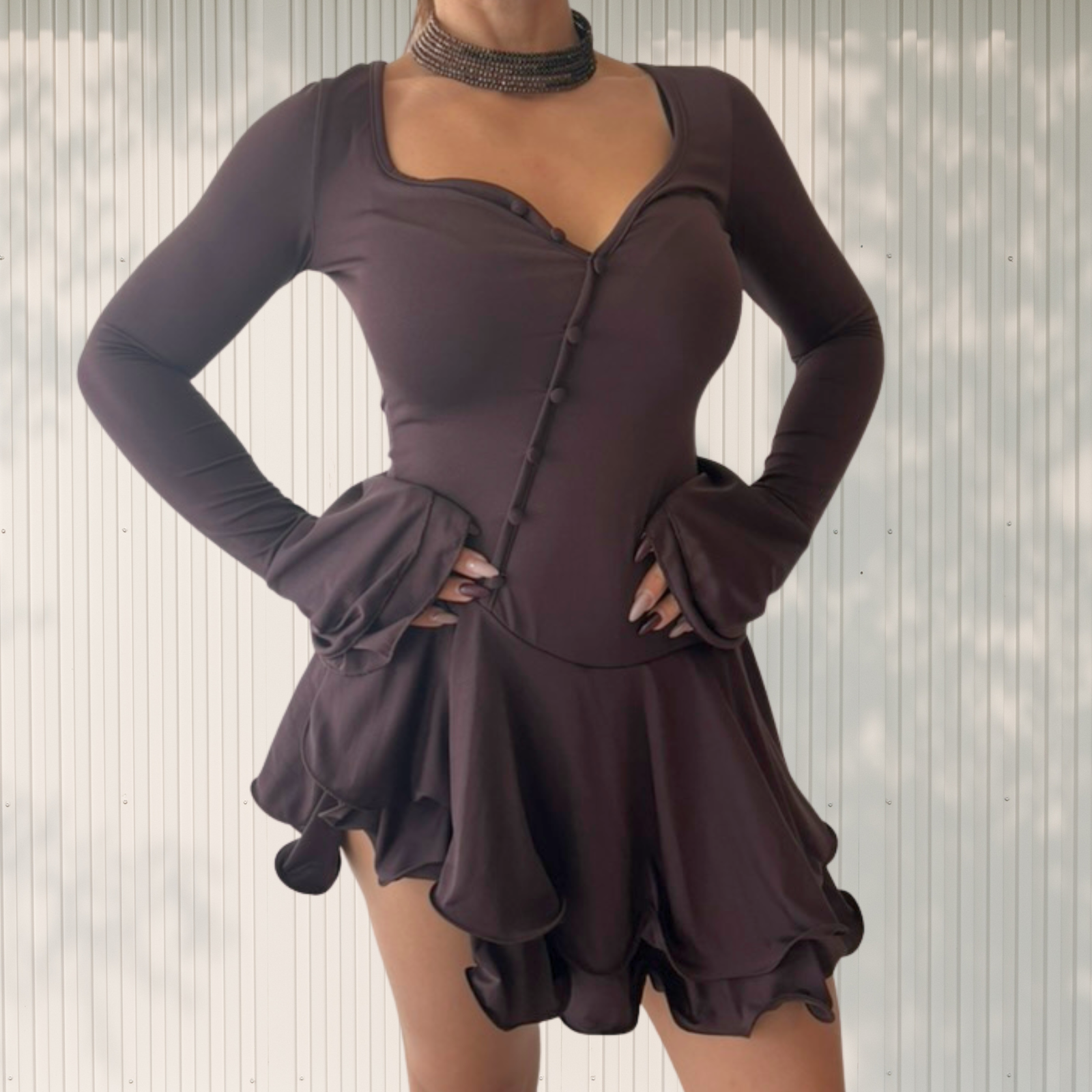 Dieses kurze braune Kleid vereint schlichte Eleganz mit liebevollen Details. Der weiche, fließende Stoff sorgt für eine bequeme Passform und betont die natürliche Silhouette auf dezente Weise.