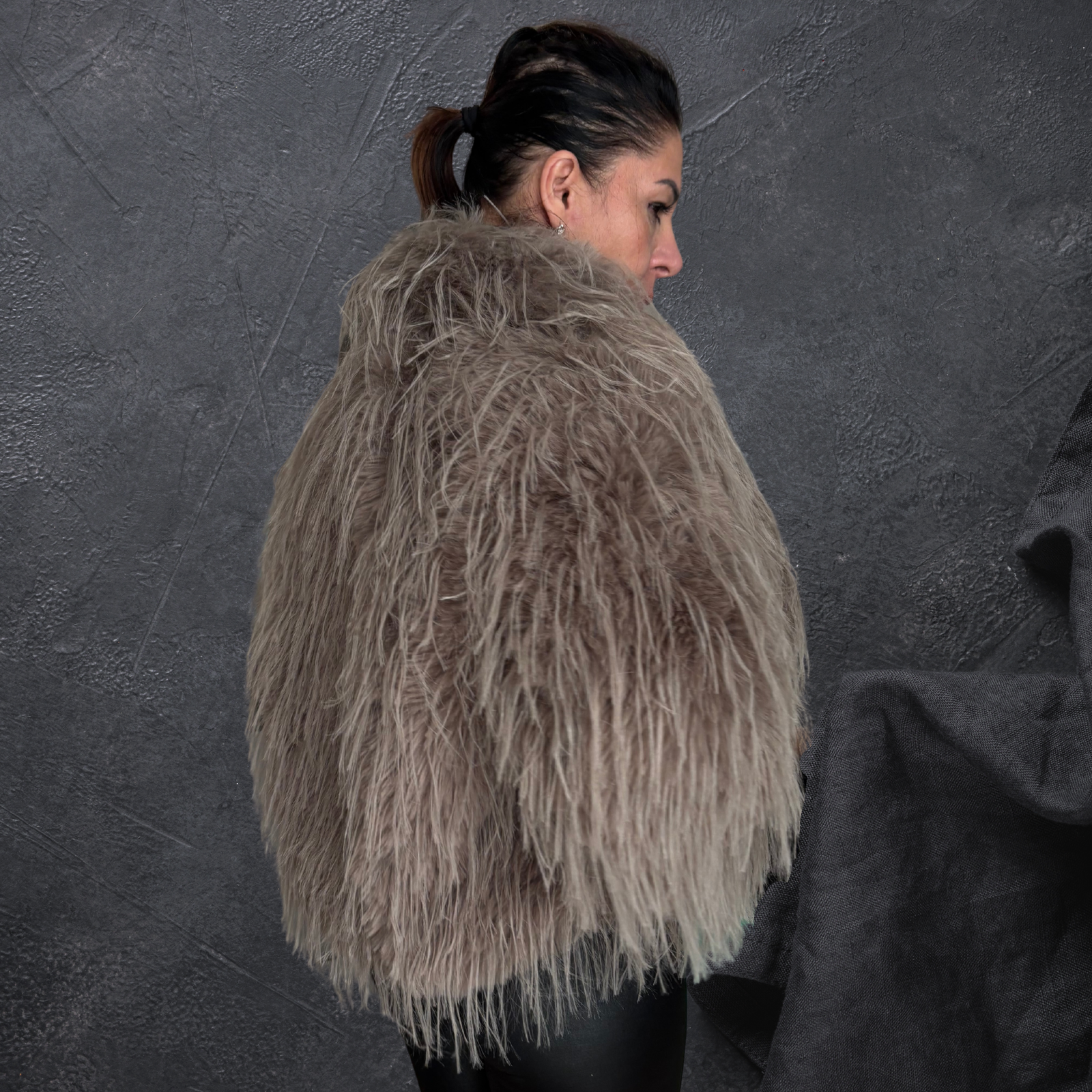 Diese elegante Damenjacke ist aus einem weichen Stoff mit langem braunigem Fell gefertigt, das ihr ein luxuriöses und warmes Aussehen verleiht.