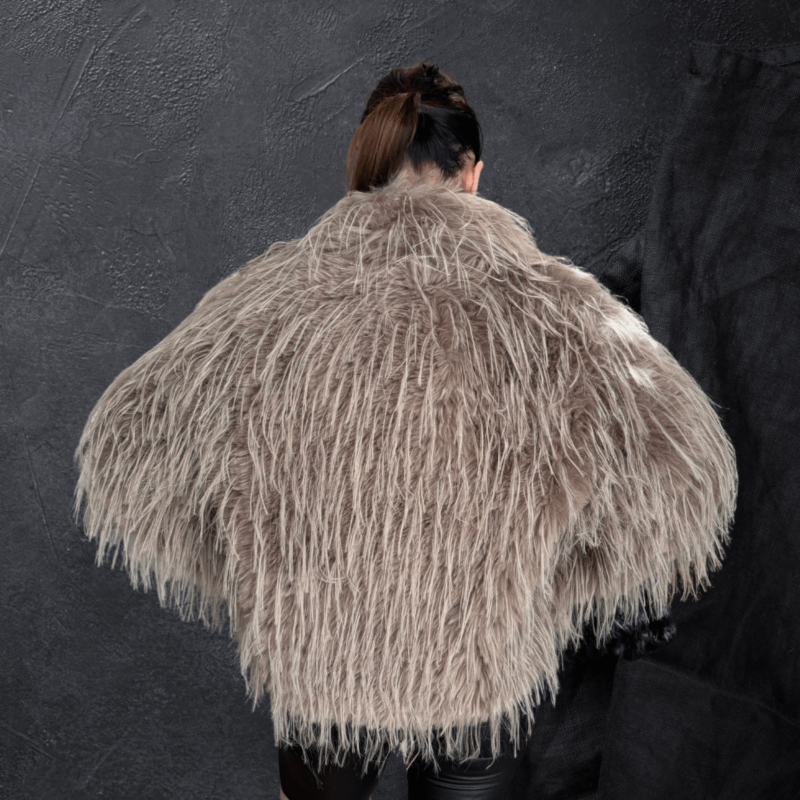 Questa elegante giacca da donna è realizzata in un morbido tessuto con pelo lungo marroncino, che le conferisce un aspetto lussuoso e caldo.