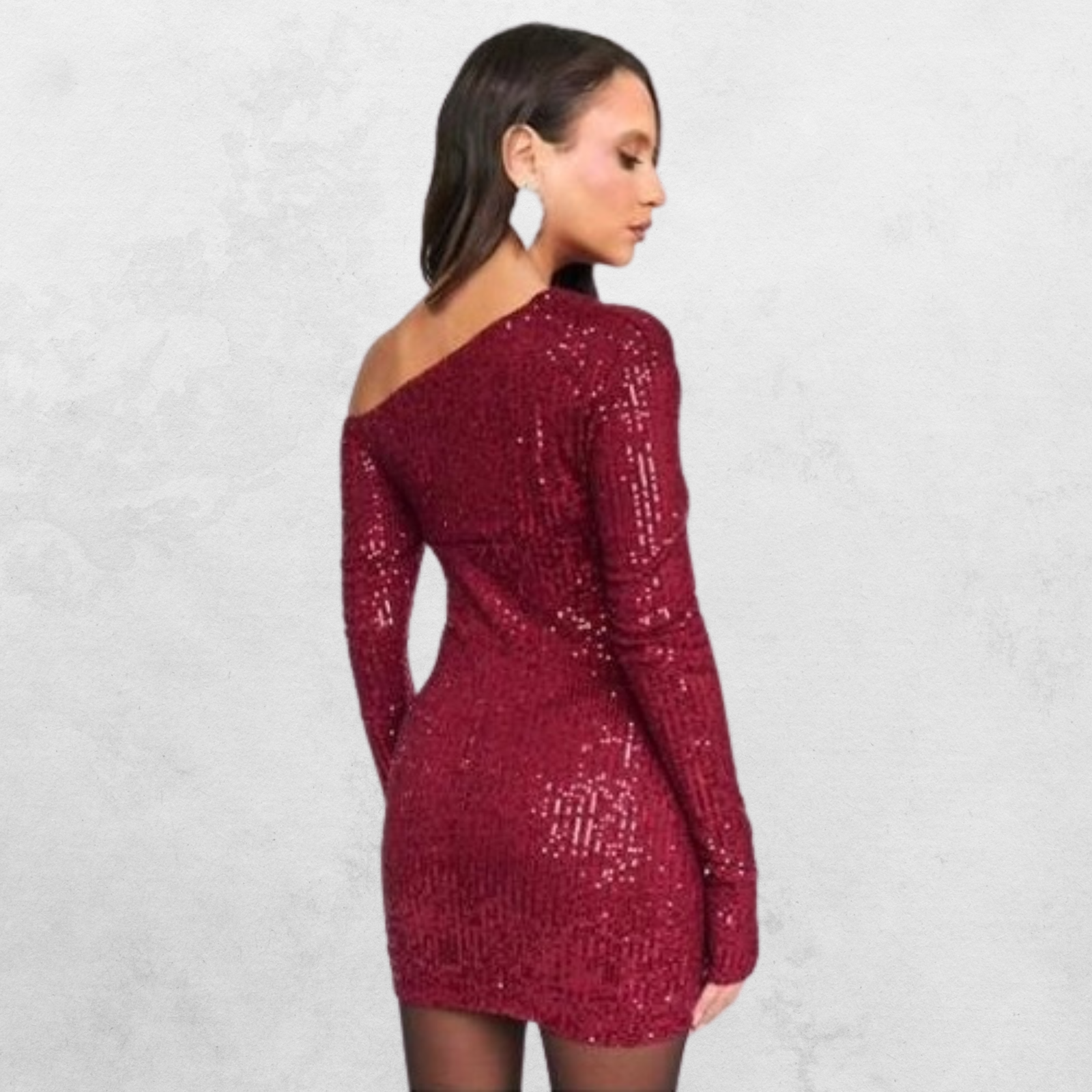 Questo abito mini in paillettes color bordeaux è la scelta ideale per chi desidera brillare in ogni occasione speciale.