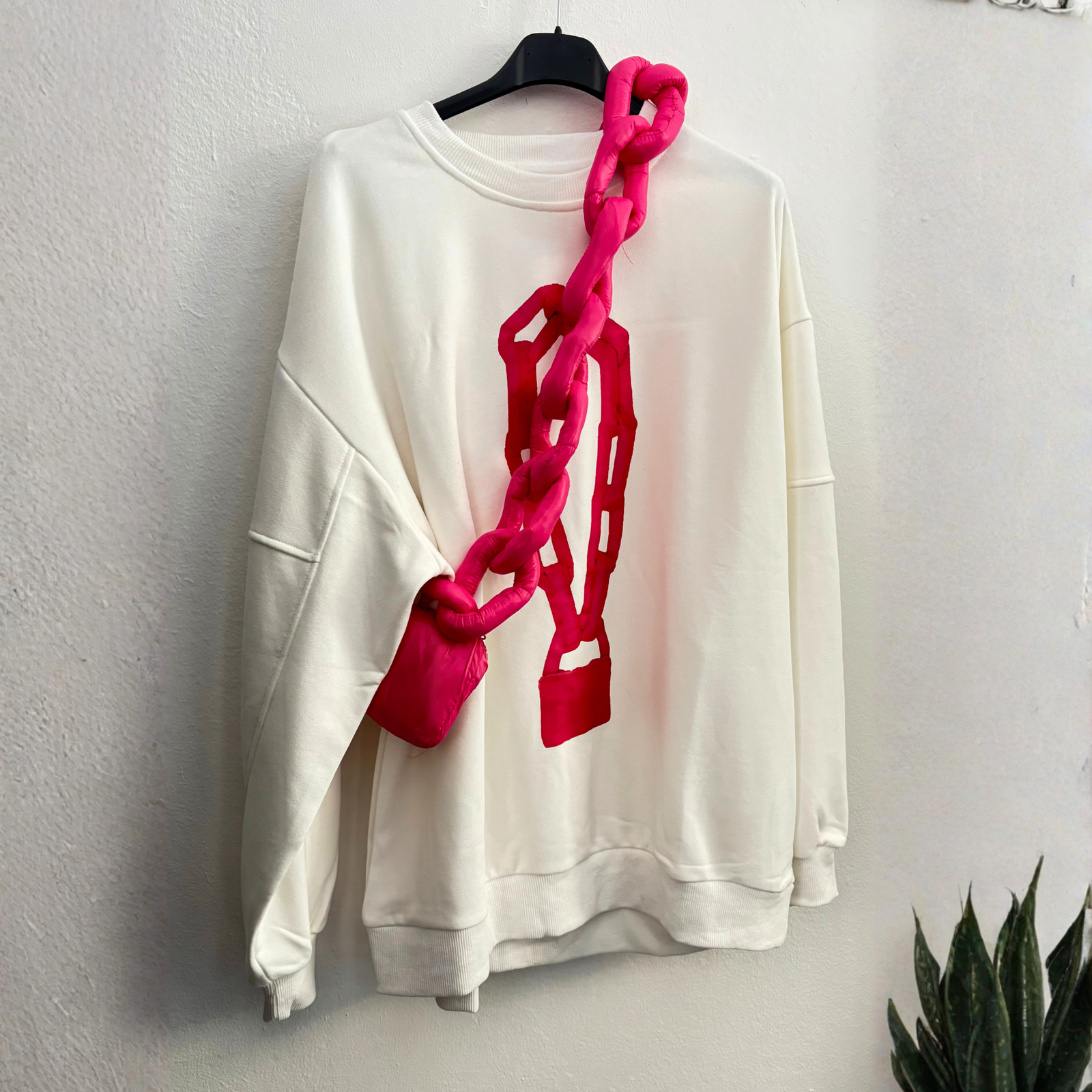 Pullover mit auffälliger, abnehmbarer pinkfarbener Kette als modisches Highlight. Weiches, bequemes Material trifft auf modernes Streetwear-Design. Die pinke Kette ist nicht fest angenäht und kann jederzeit entfernt werden – für einen wandelbaren Look zwischen minimalistisch und extravagant.