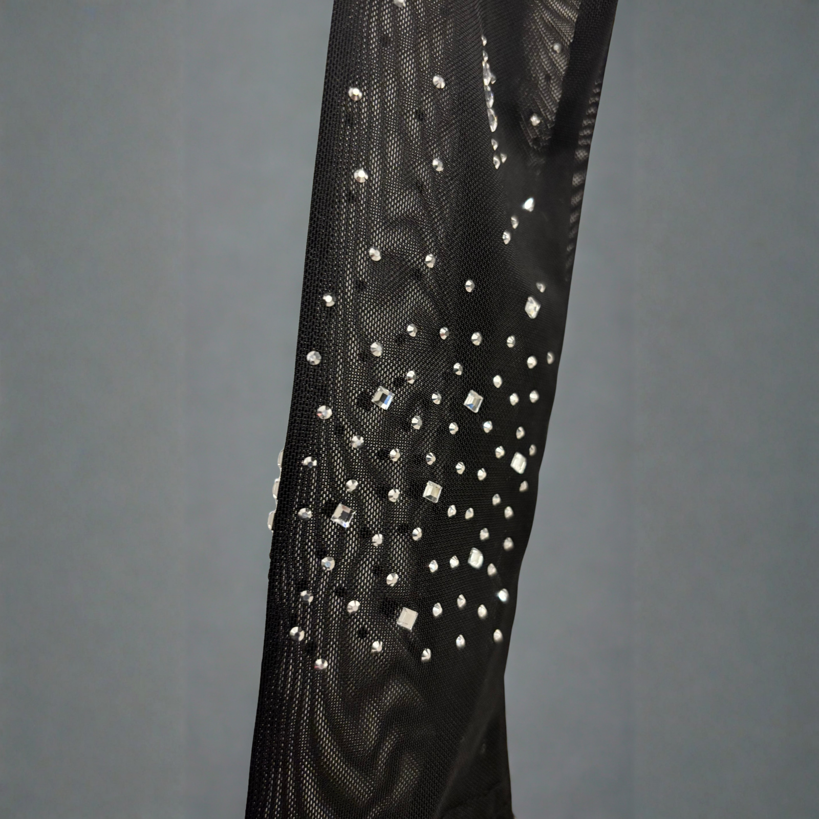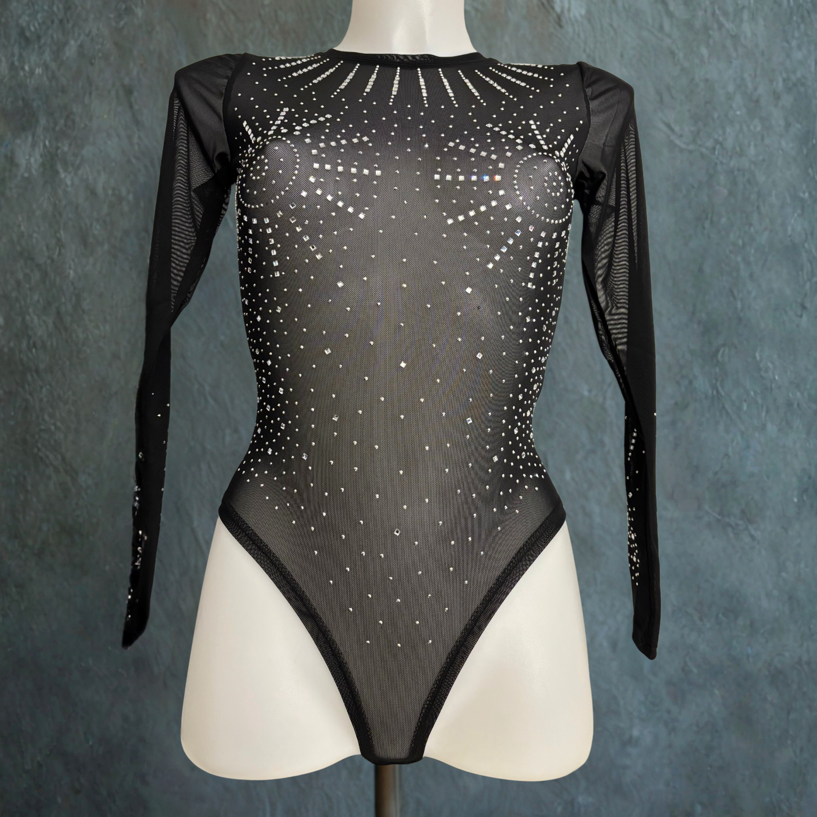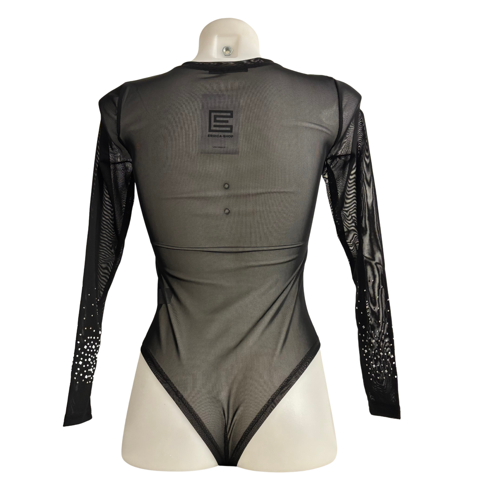Transparenter schwarzer Body mit langen Ärmeln aus elastischem Tüll und eleganten, silbere glänzenden Verzierungen. Figurbetont und sinnlich – perfekt für Partys, Abendveranstaltungen und glamouröse Looks.