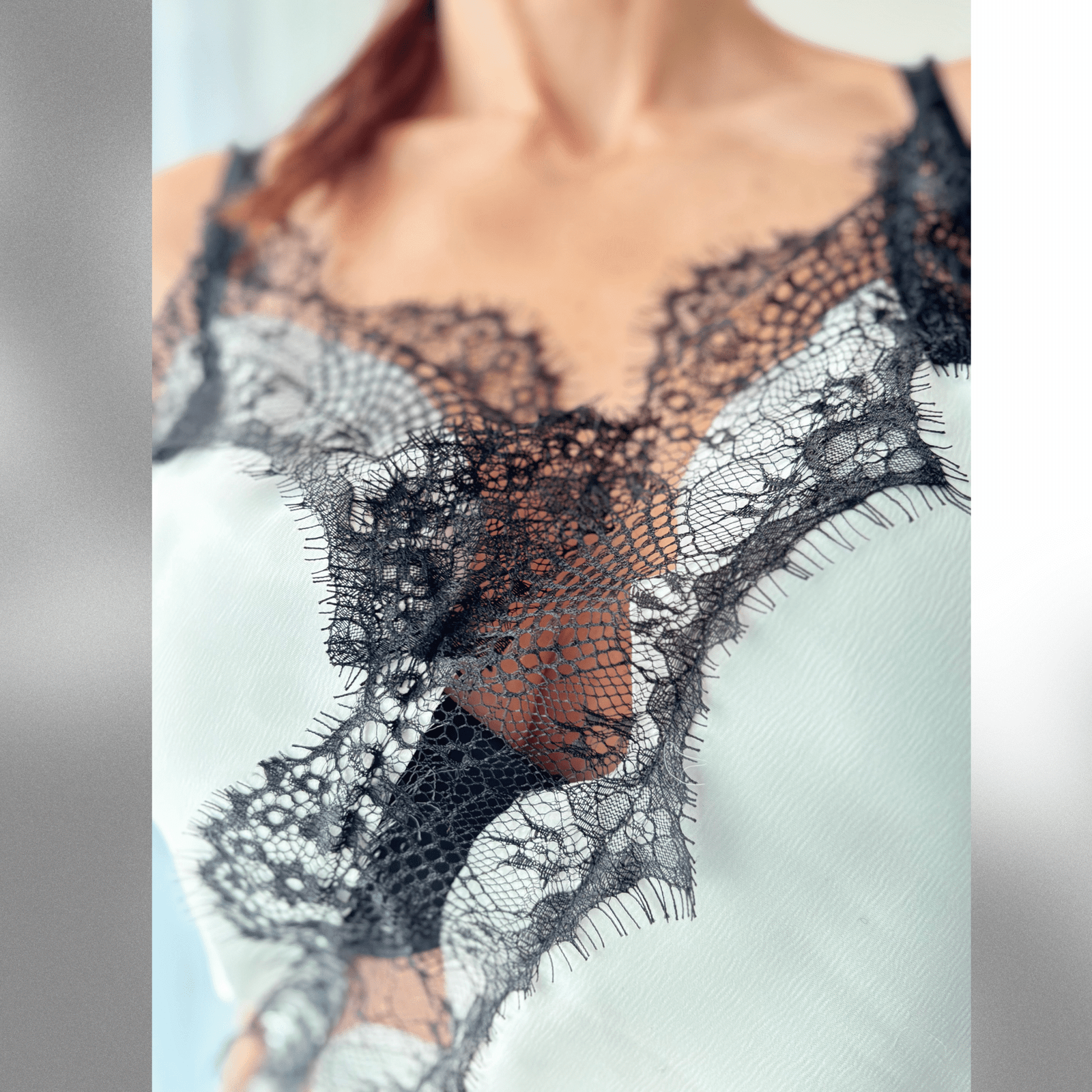 Il design è impreziosito da raffinati inserti in pizzo nero sul décolleté, lungo i lati e sull’orlo inferiore, creando un elegante contrasto cromatico che valorizza il capo e lo rende unico. Le spalline sottili e la linea pulita donano leggerezza e femminilità, rendendo l’abito perfetto per diverse occasioni.