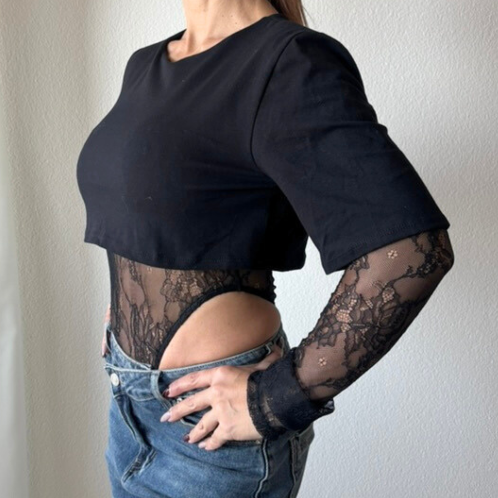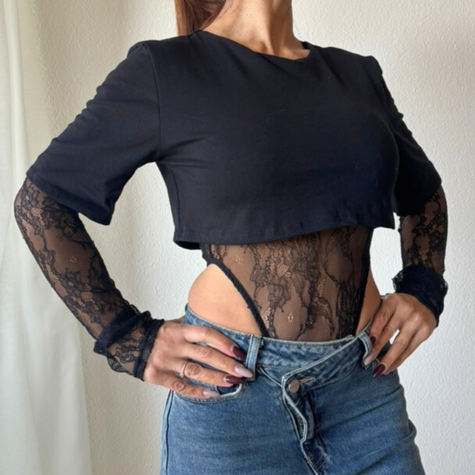 Der obere Teil besteht aus einem glatten, weichen Stoff, der für einen cleanen, klassischen Look sorgt – ideal unter Blazern oder Hemden. Der untere Teil aus feiner Spitze verleiht dem Body eine feminine und raffinierte Note, die diskret verführerisch wirkt.